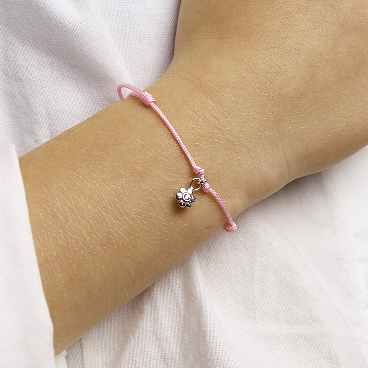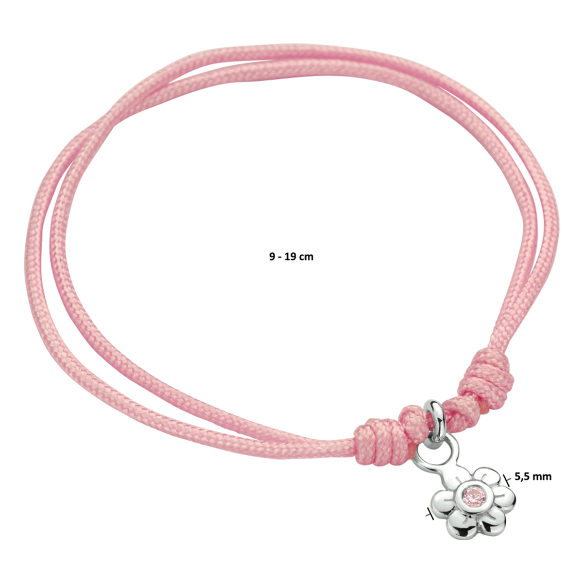 Roze gevlochten armband uitgevoerd met een hanger in de vorm van een bloem en een schitterende roze zirkonia. De armband heeft draaglengtes van 9 tot 19cm. De hanger heeft een afmeting van 10x5.5mm.